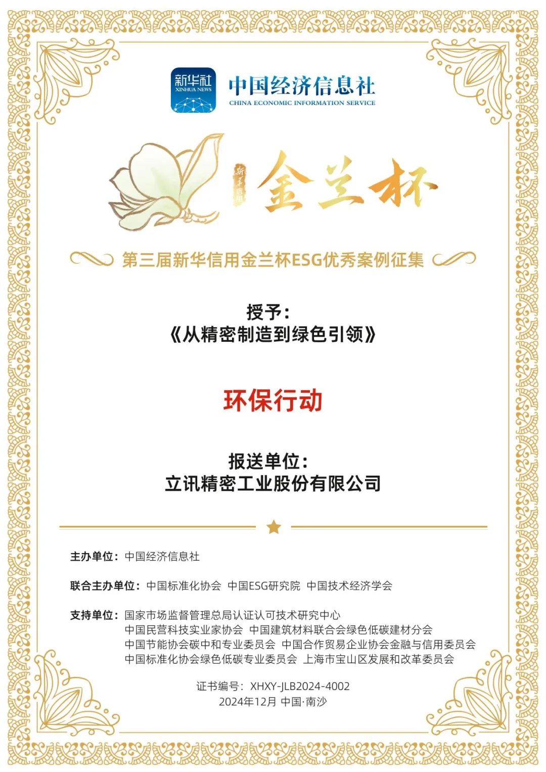 新华信用金兰杯ESG优秀案例征集活动由中国经济信息社发起,已连续举办三届,得到国内外各领域各行业的广泛关注,并形成了全领域多行业的企业绿色低碳与ESG案例库。