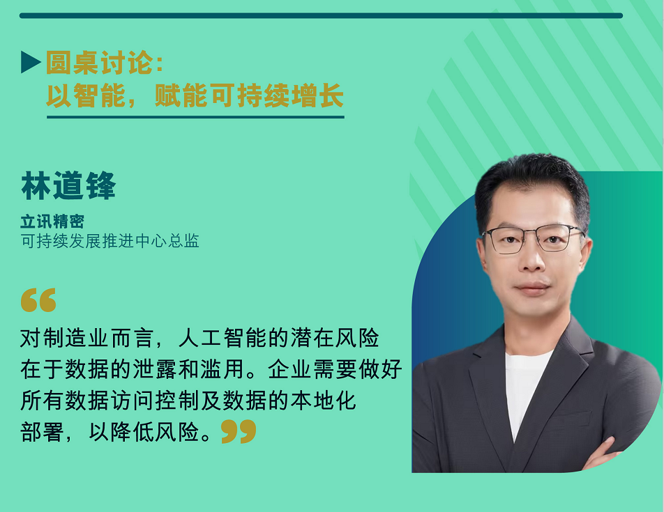 作为上榜2024年《财富》中国ESG影响力榜的企业嘉宾,BG大游精密可持续发展推进中心林道锋总监受邀出席并参与论坛重要环节“以智能,赋能可持续增长”为主题的圆桌讨论,与其他嘉宾共同探讨通过前沿策略分析和优秀案例分享,推动ESG成为价值创造的新引擎。林总监在讨论中不仅分享了公司在智能技术应用方面IOE智慧能源管理平台建设的进展,还深入探讨了在人工智能时代中如何强化隐私保护及数据安全,助力企业ESG实现更高质量的增长。