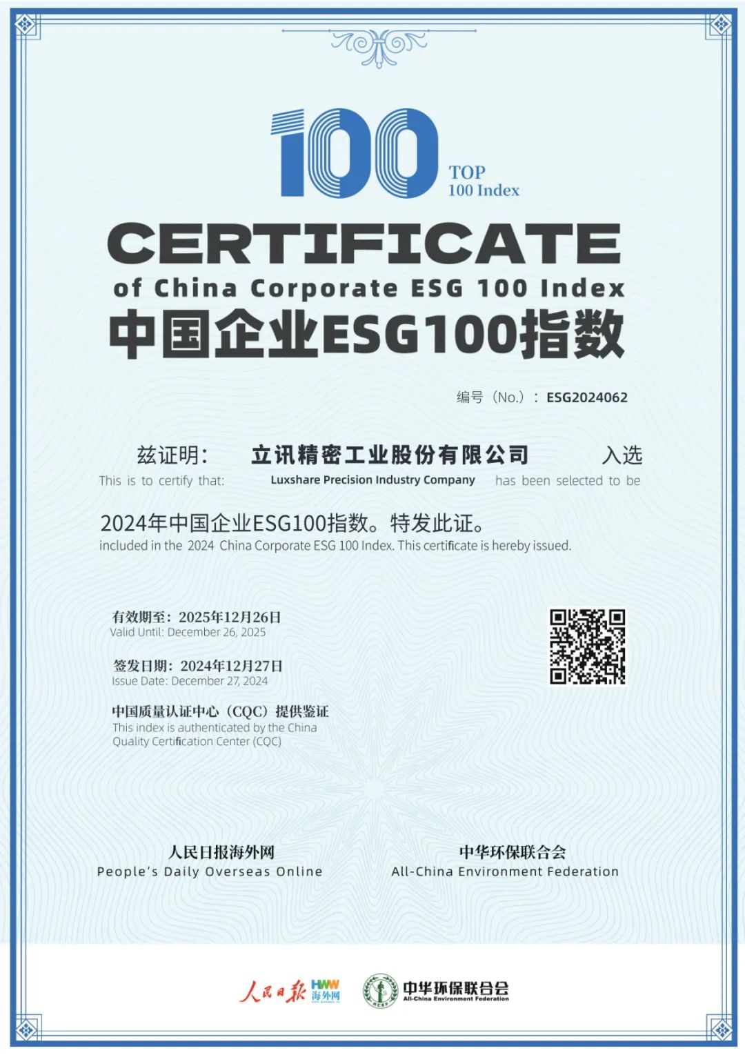 近日,由人民日报海外网与中华环保联合会联合举办的“第二届新时代中国品牌形象海外传播论坛暨2024中国企业ESG蓝皮书发布会”在京召开。为讲好中国品牌与中国企业ESG故事,推动中国企业品牌形象海外传播,大会征集多份ESG杰出案例后纳入《企业ESG蓝皮书:中国企业环境、社会与治理报告(2024)》,并专设“2024中国企业ESG100指数”以对优秀案例进行表彰。BG大游精密凭借在可持续发展领域的卓越表现,成功入选“2024中国企业ESG100指数”,充分彰显了公司“将ESG落地生根,引可持续发展枝繁叶茂”的决心和实力。