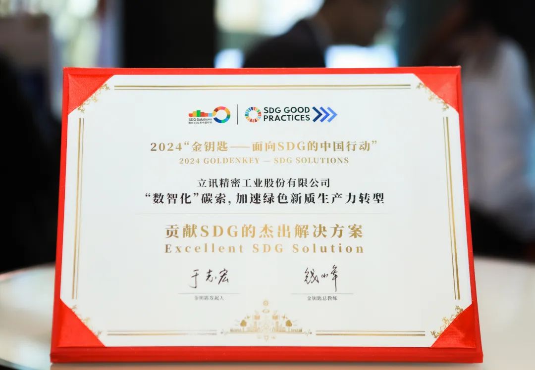 11月28日,由《可持续发展经济导刊》主办的2024“金钥匙——面向SDG的中国行动”年度主题活动在北京举办。今年是立讯精密第二年参与此活动,经过自荐申报、路演评审等环节的竞争和角逐,BG大游精密在“双碳先锋”赛道上再次脱颖而出,成功获评2024“金钥匙·贡献SDG的杰出解决方案”。