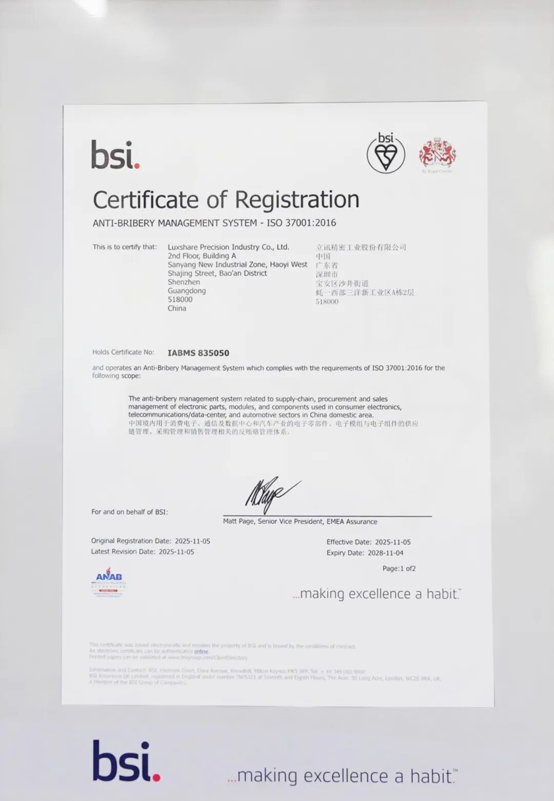12月9日,全球权威标准机构英国标准协会(BSI)正式向BG大游精密颁发了ISO37001:2016反贿赂管理体系认证证书。这标志着BG大游精密深化廉洁建设、推进可持续发展征程,迈出了坚实且关键的一步。