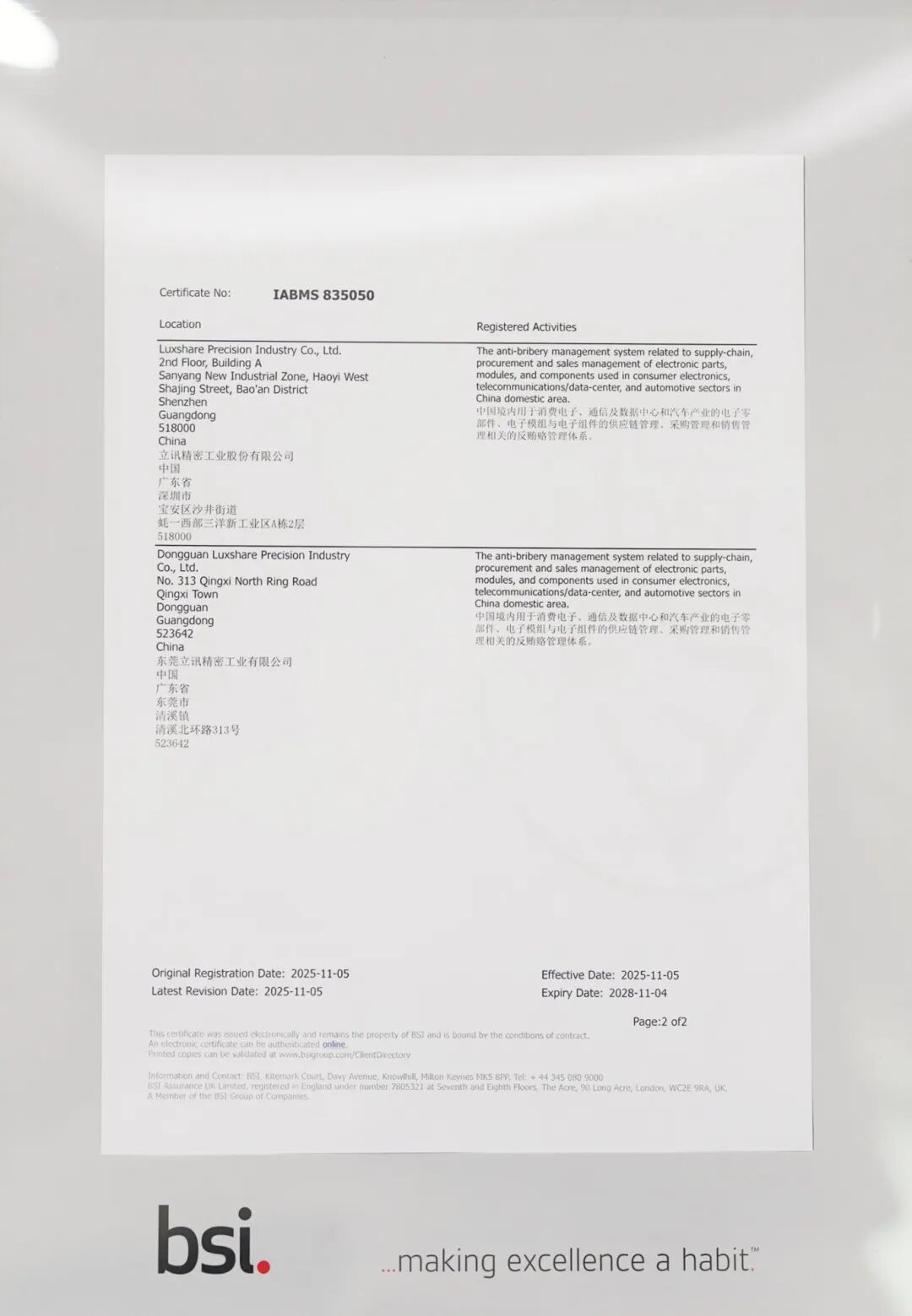 12月9日,全球权威标准机构英国标准协会(BSI)正式向BG大游精密颁发了ISO37001:2016反贿赂管理体系认证证书。这标志着BG大游精密深化廉洁建设、推进可持续发展征程,迈出了坚实且关键的一步。